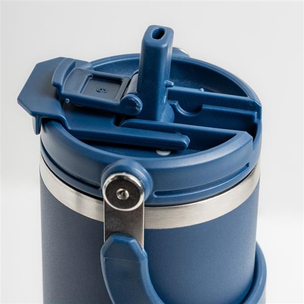 Kubek termiczny ze stali nierdzewnej o pojemności 900 ml z podwójnym wieczkiem dla lepszego uszczelnienia i skutecznej izolacji termicznej. Utrzymuje temperaturę napojów – zarówno ciepłych, jak i zimnych – przez wiele godzin, co czyni go idealnym do codziennego użytku, do pracy, na siłownię czy w podróży. Dzięki podwójnej ściance z izolacją próżniową utrzymuje zimno do 24 godzin i ciepło do 12 godzin. Składana słomka i zintegrowany ustnik zapewniają wygodne użytkowanie w ruchu. Składany metalowy uchwyt ułatwia przenoszenie i dobrze sprawdza się w codziennym użytkowaniu. Nowoczesny i funkcjonalny design oraz indywidualne opakowanie sprawiają, że jest to doskonały pomysł na prezent
