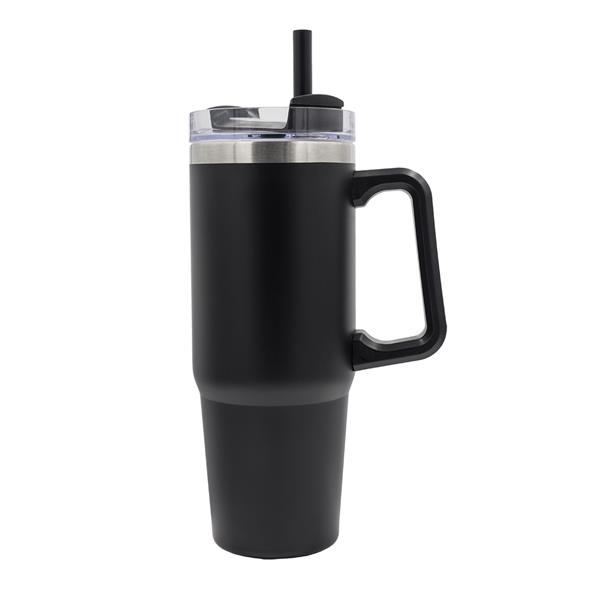 Kubek próżniowy z dwiema ściankami ze stali nierdzewnej. Wieczko z zamykanym otworem do picia i słomką. Posiada rączkę do wygodnego trzymania kubka. Sprawdzi się w podróży, pracy, czy na spacerach, zapewniając nawodnienie na długi czas dzięki dużej pojemności. Utrzymuje temperaturę powyżej 40°C przez 6 godzin.