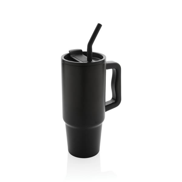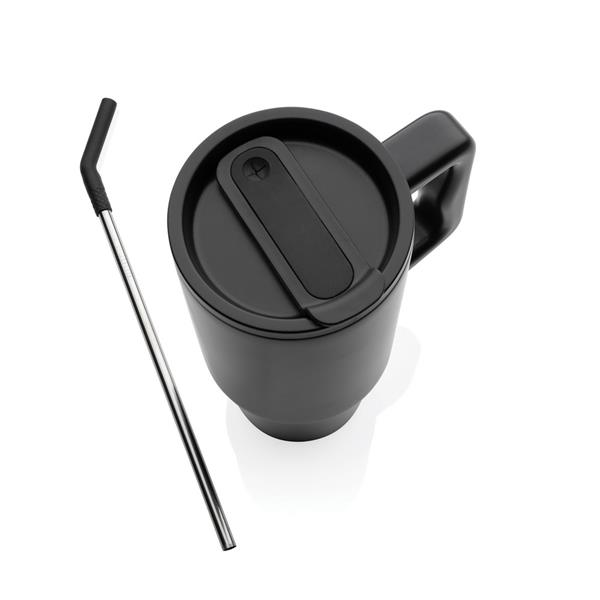Kubek termiczny 900 ml, wykonany ze stali nierdzewnej z recyklingu, podwójne ścianki ze stali nierdzewnej z próżnią pomiędzy, zakręcane wieczko z dziubkiem i słomką, zalecane mycie ręczne, ślad węglowy produktu: 0 kg CO2
