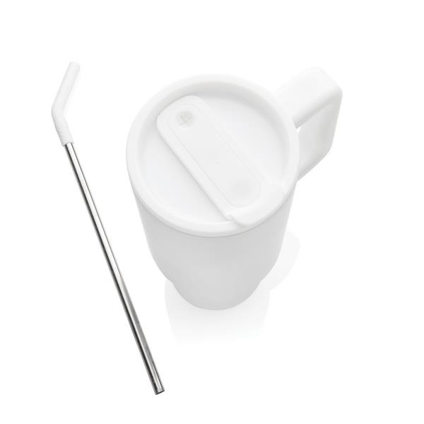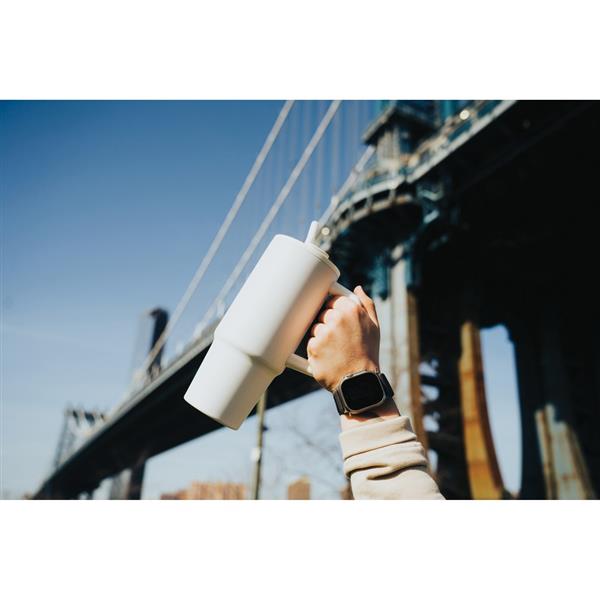 Kubek termiczny 900 ml, wykonany ze stali nierdzewnej z recyklingu, podwójne ścianki ze stali nierdzewnej z próżnią pomiędzy, zakręcane wieczko z dziubkiem i słomką, zalecane mycie ręczne, ślad węglowy produktu: 0 kg CO2