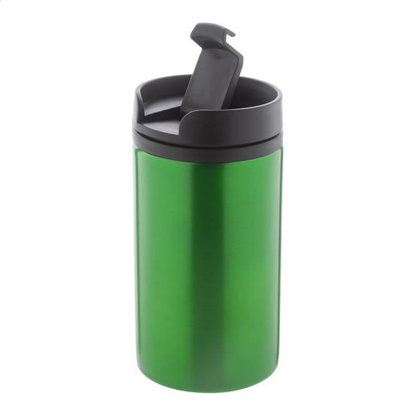 Izolowany kubek termiczny z podwójnymi ściankami, wykonany ze stali nierdzewnej z recyklingu, z wnętrzem z tworzywa sztucznego PP i pokrywką do picia. 250 ml.