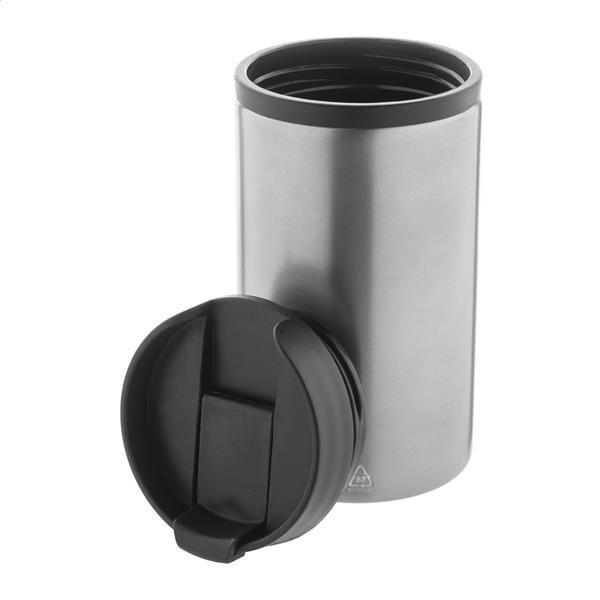 Izolowany kubek termiczny z podwójnymi ściankami, wykonany ze stali nierdzewnej z recyklingu, z wnętrzem z tworzywa sztucznego PP i pokrywką do picia. 250 ml.