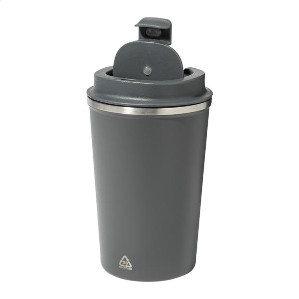 Kubek termiczny z podwójnymi ściankami, wykonany ze stali nierdzewnej z recyklingu, z pokrywką z PP. Pojemność 350 ml.