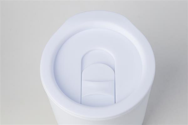 Izolowany kubek termiczny z podwójnymi ściankami, wykonany z tworzywa PP, z podstawą z recyklingowanej stali nierdzewnej i pokrywką do picia. 300 ml.