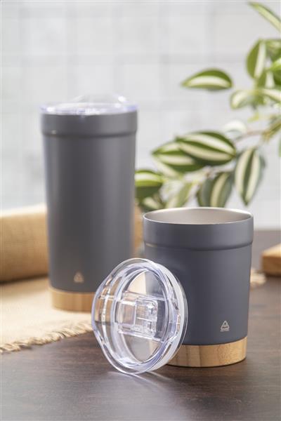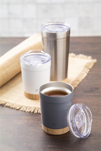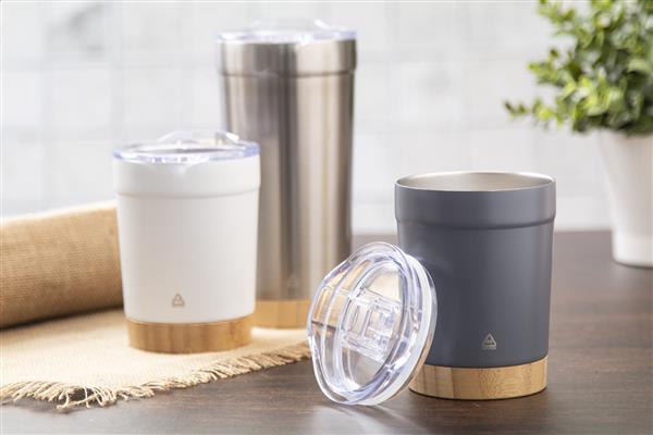 Kubek termiczny o podwójnych ściankach, izolowany próżniowo ze stali nierdzewnej pochodzącej z recyklingu, z bambusową podstawą i plastikową pokrywką do picia AS. 300ml.
