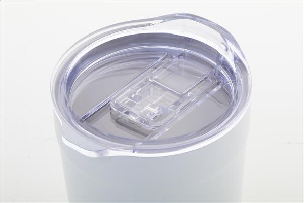 Kubek termiczny o podwójnych ściankach, izolowany próżniowo ze stali nierdzewnej pochodzącej z recyklingu, z bambusową podstawą i plastikową pokrywką do picia AS. 300ml.
