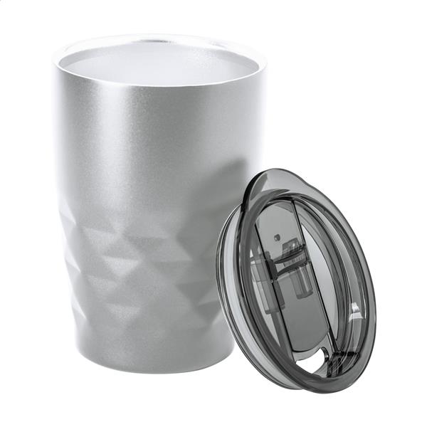 Kubek termiczny ze stali nierdzewnej o podwójnych ściankach, izolowany próżniowo miedzią z plastikową pokrywką do picia. 350ml. Izolacja miedziana utrzymuje temperaturę napojów gorących przez 12 godzin i zimnych przez 24 godziny.
