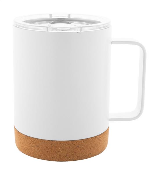 Kubek termiczny pod sublimacje ze stali nierdzewnej z podwójną ścianką, z pokrywką z ustnikiem i podstawą z naturalnego korka, 330 ml. W kartoniku.
