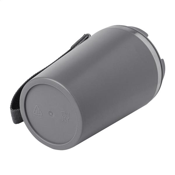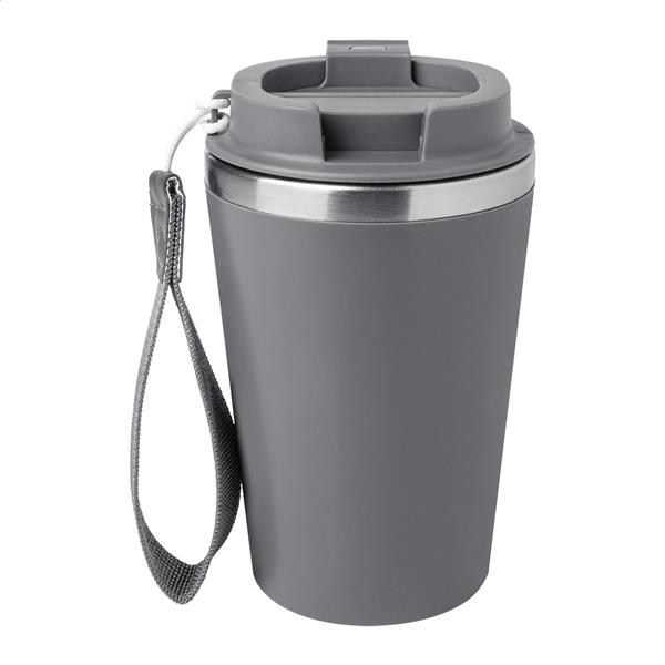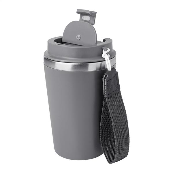 Kubek termiczny z podwójnymi ściankami ze stali nierdzewnej z recyklingu z plastikiem PP na zewnątrz i pokrywką do picia. Z paskiem RPET do przenoszenia. 350 ml.