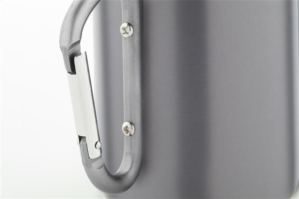 Kubek termiczny z podwójną ścianką ze stali nierdzewnej z recyklingu. Z karabińczykiem z aluminium pochodzącego z recyklingu w dopasowanym kolorze. 300 ml. W kartoniku.