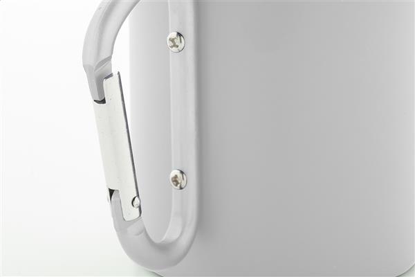 Kubek termiczny z podwójną ścianką ze stali nierdzewnej z recyklingu. Z karabińczykiem z aluminium pochodzącego z recyklingu w dopasowanym kolorze. 300 ml. W kartoniku.