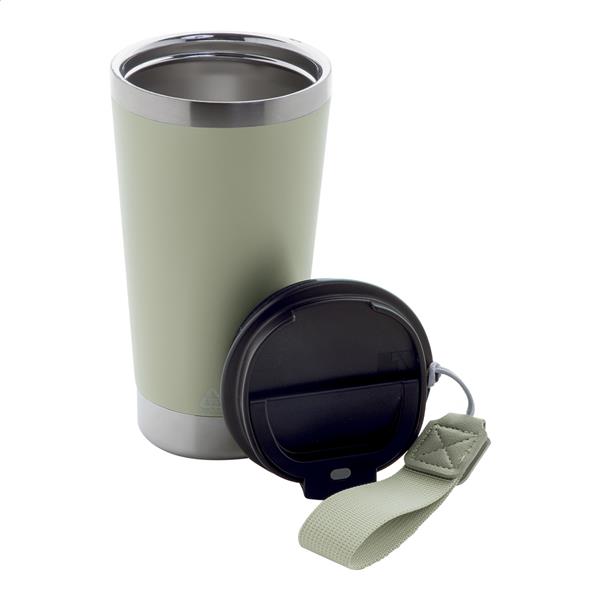 Kubek termiczny z podwójnymi ściankami, izolowany. Ze stali nierdzewnej pochodzącej z recyklingu, z pokrywką do picia z PP i paskiem do noszenia w pasującym kolorze. 430ml.