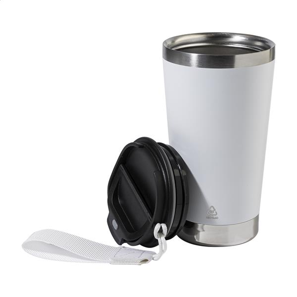 Kubek termiczny z podwójnymi ściankami, izolowany. Ze stali nierdzewnej pochodzącej z recyklingu, z pokrywką do picia z PP i paskiem do noszenia w pasującym kolorze. 430ml.