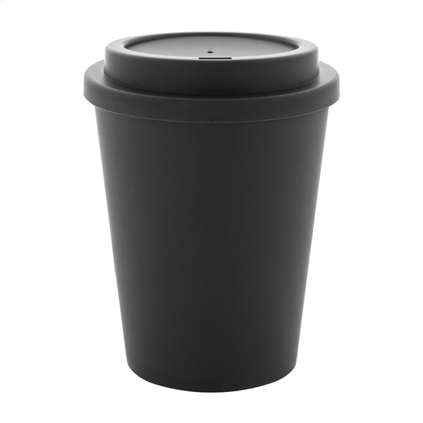 Kubek termiczny z podwójnymi ściankami, wykonany z tworzywa PP, z pokrywką do picia. Pojemność 300 ml.