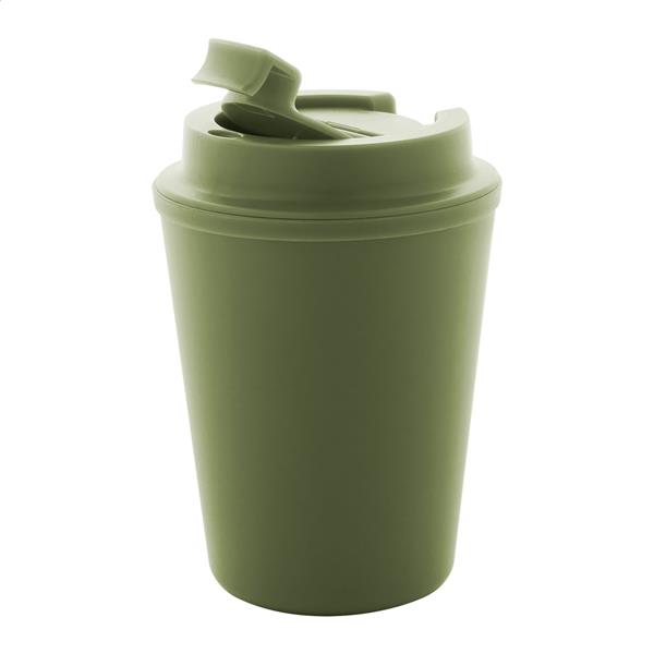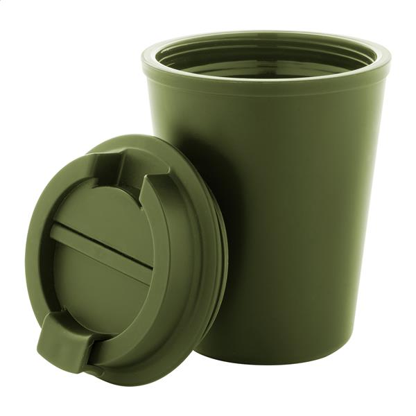 Kubek termiczny z podwójnymi ściankami, izolowany tworzywem PP z recyklingu, z pokrywką do picia. 300ml.