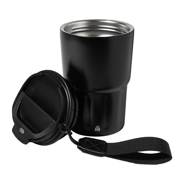 Kubek termiczny z podwójną ścianką, wykonany z recyklingowanej stali nierdzewnej, z pokrywką z PP. Z paskiem do przenoszenia z poliestru RPET. Pojemność 350 ml.