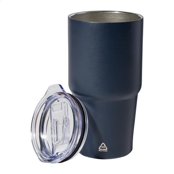 Dwuścienny, izolowany próżniowo kubek termiczny ze stali nierdzewnej z recyklingowaną pokrywką z tworzywa PS. 600 ml.