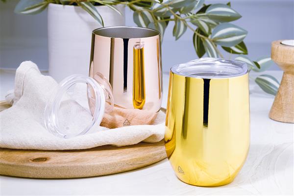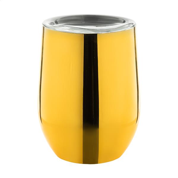 Kubek termiczny z podwójnymi ściankami, wykonany ze stali nierdzewnej z recyklingu, z błyszczącym metalicznym wykończeniem i plastikową pokrywką. 350 ml.