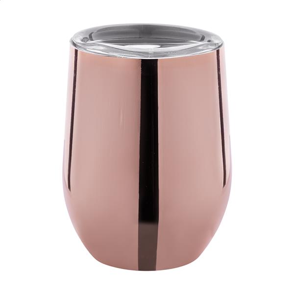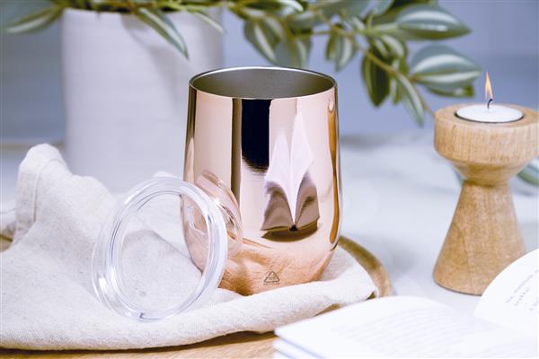Kubek termiczny z podwójnymi ściankami, wykonany ze stali nierdzewnej z recyklingu, z błyszczącym metalicznym wykończeniem i plastikową pokrywką. 350 ml.