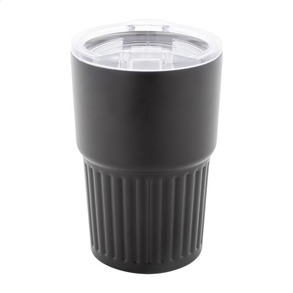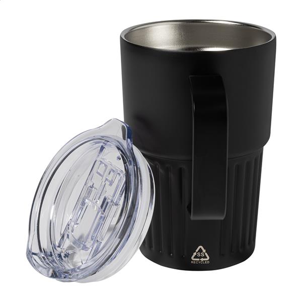 Izolowany kubek termiczny z podwójnymi ściankami, wykonany ze stali nierdzewnej z recyklingu, z pokrywką z tworzywa ABS. Pojemność 470 ml.