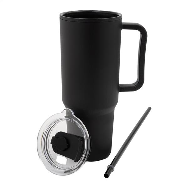 Izolowany kubek termiczny z podwójnymi ściankami, wykonany z tworzywa PP, z pokrywką i słomką. Pojemność 1100 ml.