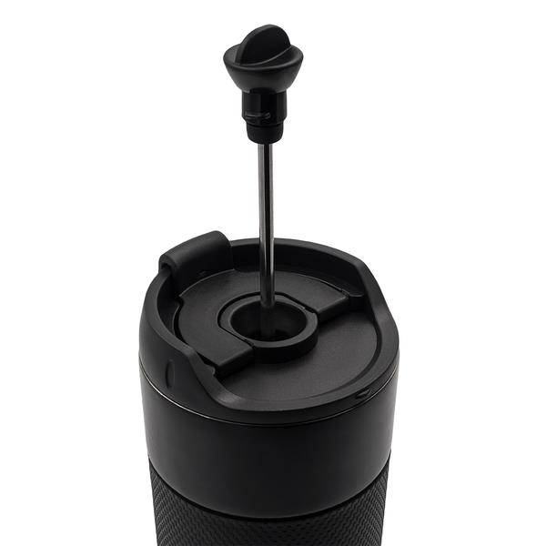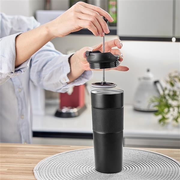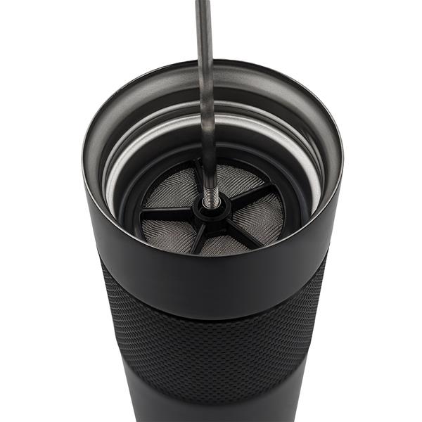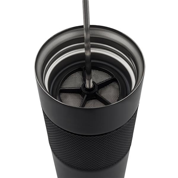 Kubek termiczny o pojemności 450 ml. To doskonałe połączenie zaparzacza French Press z kubkiem termicznym. Dwie ścianki ze stali nierdzewnej, wewnątrz stal nierdzewna 18/8 o podwyższonej jakości. Próżnia pomiędzy ściankami zapewnia bardzo dobre właściwości termoizolacyjne. Utrzymuje temperaturę powyżej 40°C przez 6h.