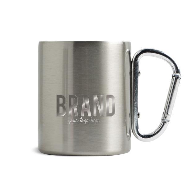 Kubek z podwójną ścianką i karabińczykiem. Termiczny kubek o pojemności 300 ml, łatwy w użyciu, transporcie i czyszczeniu. Z podwójną ścianką, która pomaga utrzymać temperaturę płynów. Wykonany z materiałów z recyklingu, bardziej przyjazny dla środowiska.