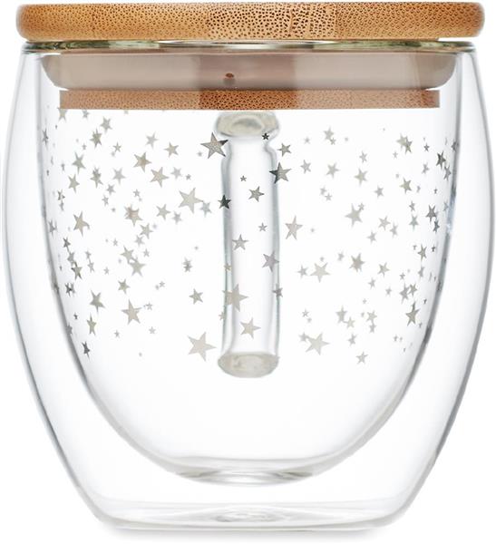 Szklany kubek borokrzemianowy o podwójnych ściankach, z motywem gwiazdek i bambusową pokrywką. Pojemność: 220 ml. Bambus jest produktem naturalnym, dlatego mogą wystąpić nieznaczne różnice w kolorze, wzorze i rozmiarze.
