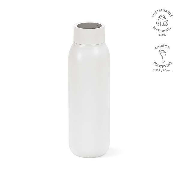 Wzbogać swoje źródło nawodnienia dzięki naszej butelce z recyklingowanej stali nierdzewnej o pojemności 650 ml (600 ml netto). Jest szczelna, dwuścienna i ładowana bezprzewodowo (USB-C). Zachowaj chłód dzięki wyświetlaczowi LED temperatury i ciesz się antypoślizgową podstawą. Podkreśl swój ekologiczny styl.