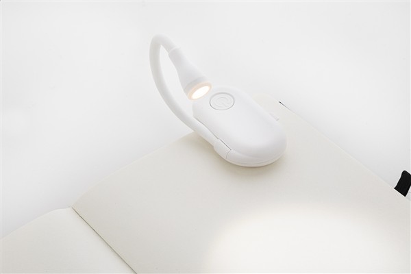 Klips do czytania z ABS z elastyczną lampką LED i wbudowaną ładowalną baterią USB (220 mAh). Z ciepłym, naturalnym i chłodnym trybem światła. W zestawie kabel do ładowania USB.