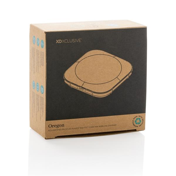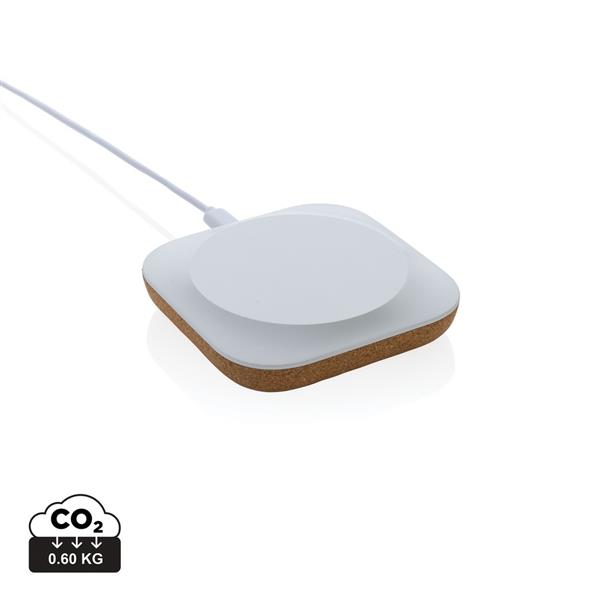 Ładowarka bezprzewodowa 10W, wykonana z korka z certyfikatem FSC® oraz ABS z recyklingu z certyfikatem RCS, całkowita zawartość materiałów z recyklingu obliczona na podstawie wagi całkowitej przedmiotu: 33%, działa z telefonami posiadającymi możliwość ładowania indukcyjnego, wejście USB typu C 5V/2A, 9V/2A, 120 cm kabel z TPE z recyklingu z certyfikatem RSC w komplecie, w pudełku z papieru kraftowego z certyfikatem FSC® mix, ślad węglowy produktu: 0,68 kg CO2