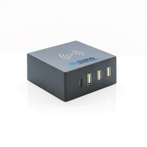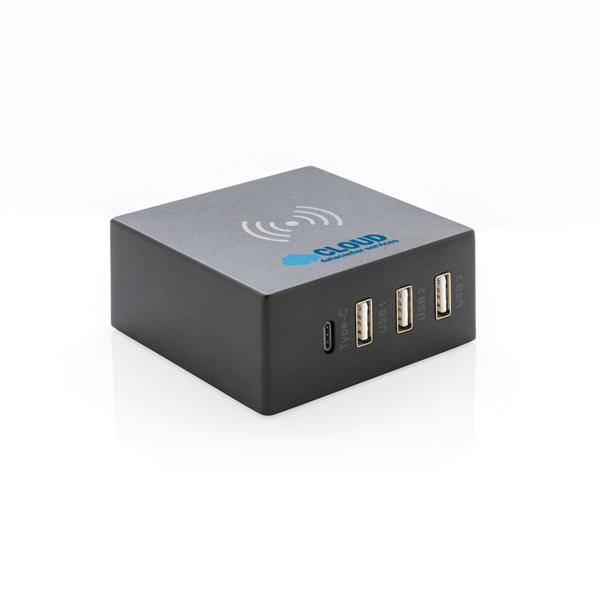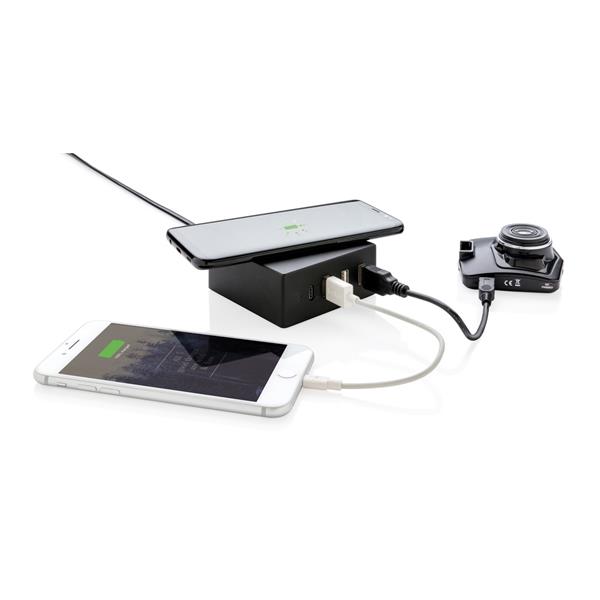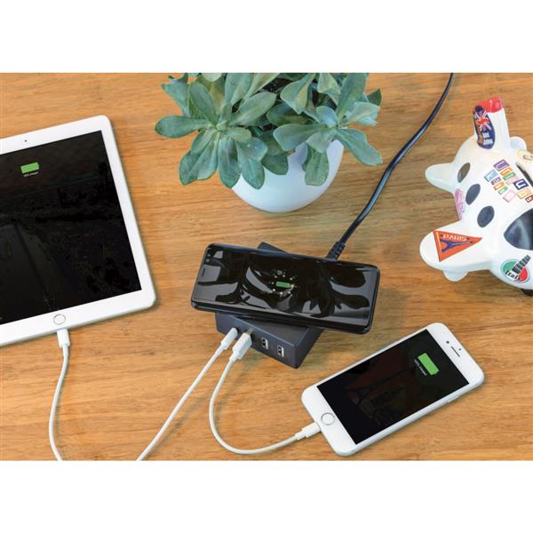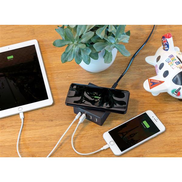 Ładowarka bezprzewodowa 10W 2 w 1, porty do ładowania USB o łącznej mocy 6A oraz port USB typu C 3A, bezprzewodowe ładowanie jest kompatybilne ze wszystkimi urządzeniami posiadającymi możliwość ładowania indukcyjnego, wejście AC 100-240V/50-60Hz, wyjście 5V/6A, kabel UE 150 cm w komplecie