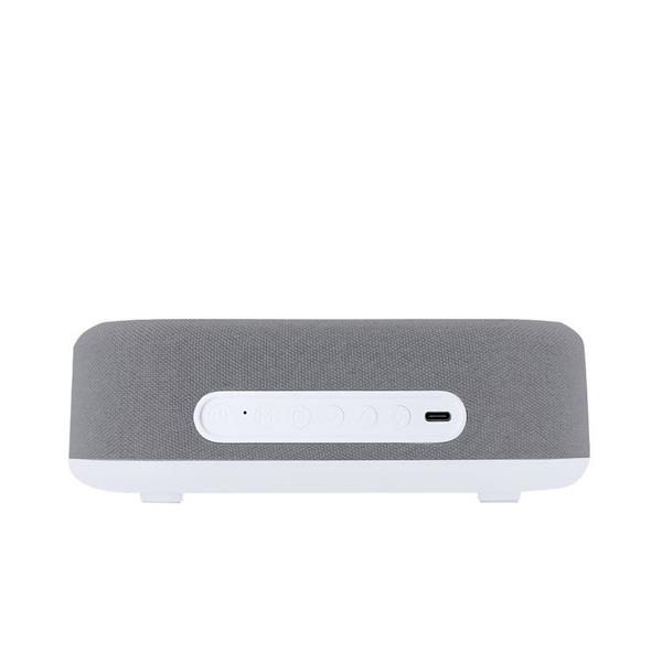 Ładowarka bezprzewodowa 15W, działa z urządzeniami posiadającymi możliwość ładowania indukcyjnego, budzik z alarmem i zegarem, lampa z 26 diodami LED, regulowana jasność, bezprzewodowy głośnik BT 5.0 5W, bateria 1200 mAh, wejście USB-C 5-9V/3-2A, kabel USB-C w komplecie, produkt wykonany z poliestru i ABS