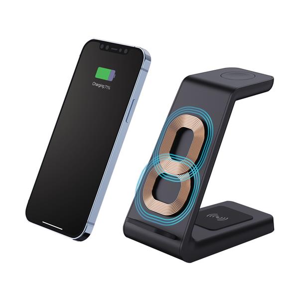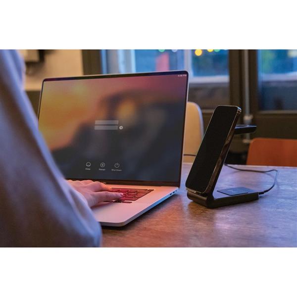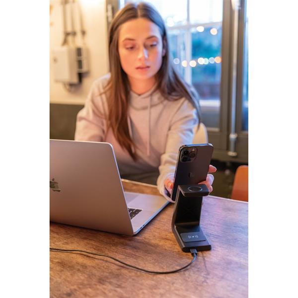Bezprzewodowa podstawka ładująca 15W wykonana z ABS z recyklingu, zawartość materiałów z recyklingu obliczona na podstawie wagi całkowitej przedmiotu: 65%, bezprzewodowa ładowarka dual coil 15, bezprzewodowa ładowarka 5W z tyłu i ładowarka 3W, 120 cm kabel USB typu C z TPE z recyklingu z certyfikatem RCS w komplecie, opakowanie o zmniejszonej zawartości plastiku, produkt nie zawiera PVC, ślad węglowy produktu: 1,71 kg CO2