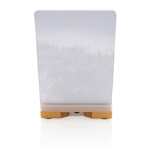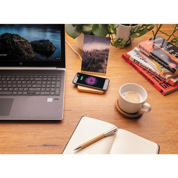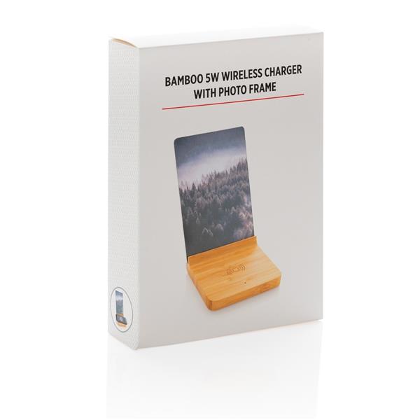 Ładowarka bezprzewodowa 5W, ramka do zdjęć o wymiarach 15 x 10 cm, podstawa wykonana z bambusa, ramka z akrylu, bezprzewodowe ładowanie jest kompatybilne ze wszystkimi urządzeniami posiadającymi możliwość ładowania indukcyjnego, wejście 5V/2A, wyjście bezprzewodowe 5V/1A 5W, 150 cm kabel micro USB z TPE bez dodatku PVC w komplecie