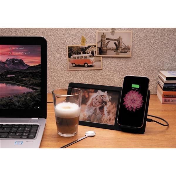 Ładowarka bezprzewodowa 5W, stojak na telefon, ramka do zdjęć o wymiarach 10 x 15 cm, bezprzewodowe ładowanie jest kompatybilne ze wszystkimi urządzeniami posiadającymi możliwość ładowania indukcyjnego, wejście 5V/2A, wyjście 5/1A 5W, 150 cm kabel micro USB z TPE bez dodatku PVC w komplecie, ślad węglowy produktu: 1,78 kg CO2