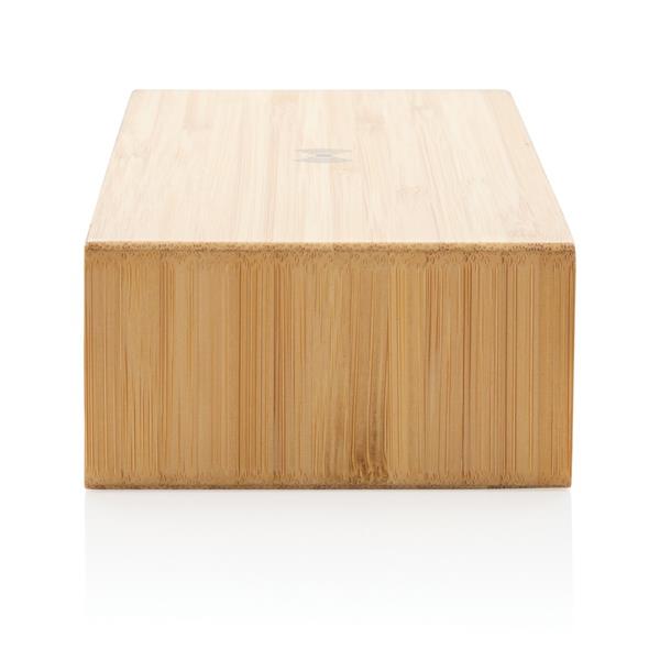Ładowarka bezprzewodowa 5W, wbudowany zegar cyfrowy, obudowa wykonana z naturalnego bambusa, wejście USB do ładowania za pomocą kabla, bezprzewodowe ładowanie jest kompatybilne ze wszystkimi urządzeniami posiadającymi możliwość ładowania indukcyjnego, wejście 5V/1.5A, wyjście USB 5V/1A, wyjście bezprzewodowe 5V/1A 5W, ślad węglowy produktu: 1,4 kg CO2