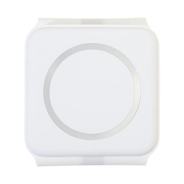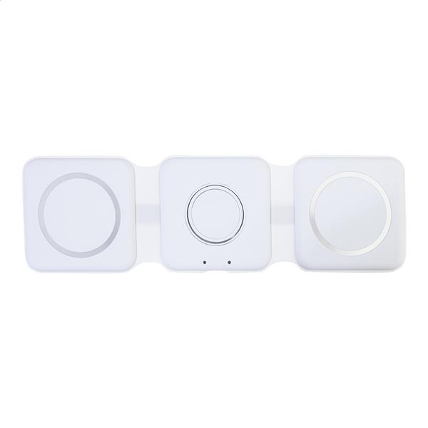 Składany uchwyt na telefon komórkowy i zestaw z bezprzewodową ładowarką z recyklingowanego ABS. Z magnetyczną szybką ładowarką bezprzewodową (15 W), bezprzewodową ładowarką (5 W) do słuchawek i bezprzewodową ładowarką (2,5 W) do smartwatchy (tylko Apple®). W zestawie samoprzylepny metalowy pierścień do telefonów bez powierzchni magnetycznej. W zestawie kabel USB do ładowania.