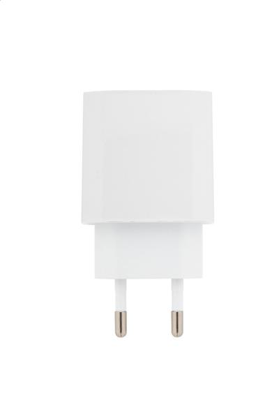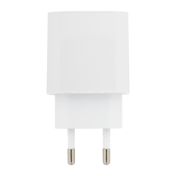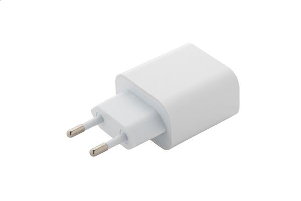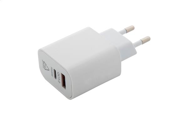 Szybko ładująca ładowarka USB z ABS z recyklingu z 1 portem USB i 1 portem USB-C. Obsługuje technologię szybkiego ładowania (PD20W / QC3.0). Z 2-biegunową wtyczką europejską.