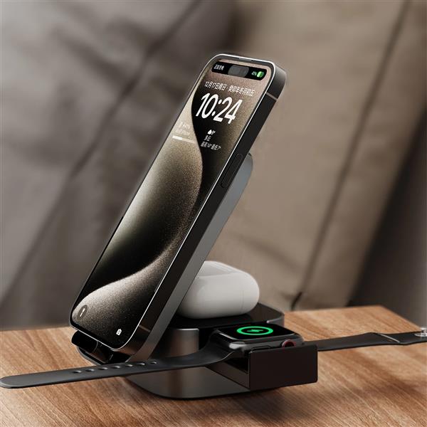 Dzięki ładowarce Dudao A11Pro+ możesz ładować telefon, smartwatcha i słuchawki jednocześnie. Na przodzie ładowarki znajduje się miejsce na smartfon, z tyłu na słuchawki, a zegarek można umieścić w specjalnym, wysuwanym module. To oznacza koniec z plątaniną kabli i bałaganem na biurku.