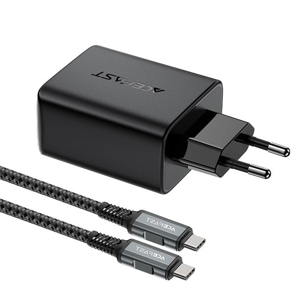 Szybka ładowarka sieciowa 2w1 marki Acefast. Posiada port USB Typ C, który umożliwia ładowanie z maksymalną mocą 65W oraz port USB 5W. Za pomocą wtyczki UBS Typ C można zasilać notebooki, które do pracy wymagają mocy o wartości do 65W (sprawdź specyfikację swojego komputera). Pozwala na szybkie ładowanie dwóch urządzeń jednocześnie m.in. w standardach PPS, Power Delivery, Quick Charge 3.0, AFC i FCP. Jest wykonana z ognioodpornego materiału PC. Została wyposażona w wiele zabezpieczeń takich jak np. przed przegrzaniem, przepięciem, wysokim napięciem czy przeciążeniem. W zestawie z ładowarką znajduje się kabel USB Typ C – USB Typ C o długości 1,8m. Elektroniczne komponenty ładowarki zostały wykonane w technologii GaN czyli są oparte na azotku galu, a nie na krzemie. GaN to lepsza efektywność pracy i mniejsze zużycie energii.