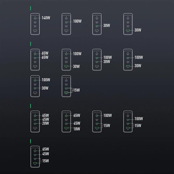 Za sprawą 3 portów USB-C i 1 portu USB-A masz możliwość ładowania aż czterech urządzeń jednocześnie. To idealne rozwiązanie dla osób, które cenią sobie wygodę i chcą mieć wszystkie swoje urządzenia zawsze naładowane.