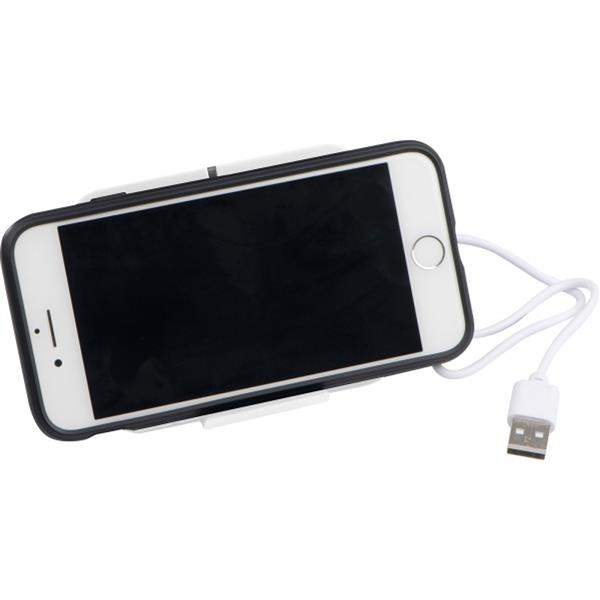 Ładowarka indukcyjna (QI standard) z plastiku. Może służyć także jako stojak na telefon. Kabel micro USB w zestawie. Moc wejściowa: 5V/2A, moc wyjściowa 5V/1A.