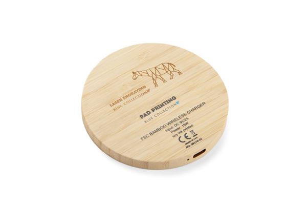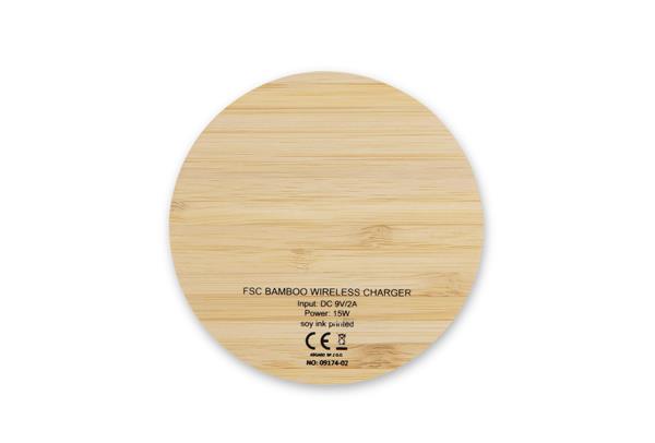 Okrągła ładowarka indukcyjna FRESTI 15W z obudową wykonaną z naturalnego bambusa. Dzięki lekkiej i smukłej konstrukcji jest poręczna i estetyczna. Odłączany czarny kabel zapewnia wygodę użytkowania. Doskonała jako gadżet promocyjny, łączący nowoczesną technologię z naturalnym designem.