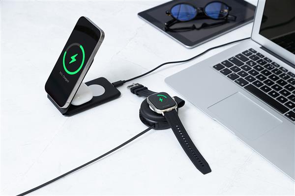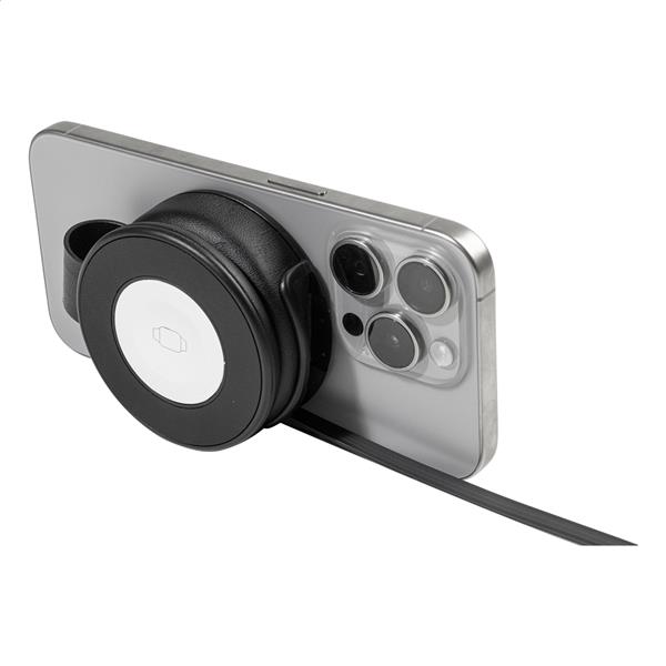 Luksusowy, składany zestaw ładowarek bezprzewodowych z recyklingowanej skóry PU z magnetyczną szybką ładowarką bezprzewodową (15 W), dodatkową ładowarką bezprzewodową (2,5 W) do smartwatchy (Apple® i Samsung®) oraz wbudowanym teleskopowym kablem USB-C. W zestawie samoprzylepny metalowy pierścień do korzystania z funkcji ładowania magnetycznego w dowolnym urządzeniu z funkcją ładowania bezprzewodowego. Kompatybilny z iPhone® 12 i nowszymi.