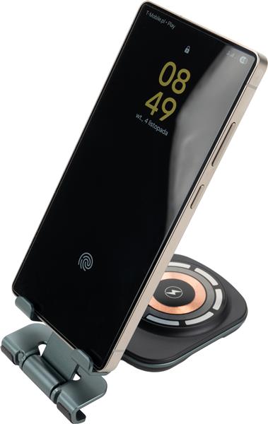 Uniwersalna ładowarka bezprzewodowa pełniąca jednocześnie funkcję praktycznego stojaka na telefon. Urządzenie jest kompatybilne z produktami Apple, takimi jak iPhone, AirPods i Apple Watch. Oferuje szeroki zakres mocy wyjściowej (15W, 10W, 7,5W, 5W), dostosowując się do potrzeb ładowanego sprzętu, a zasilana jest przez nowoczesny interfejs Type-C (wejście: 5V/9V/12V – 2A maks.). Konstrukcja wykonana jest z wytrzymałego połączenia stopu aluminium, PC oraz ABS, co zapewnia trwałość i elegancki wygląd. W zestawie znajduje się ładowarka, metrowy kabel do szybkiego ładowania Type-C oraz neutralne pudełko prezentowe o wymiarach 7,2 × 2,2 × 17 cm.
