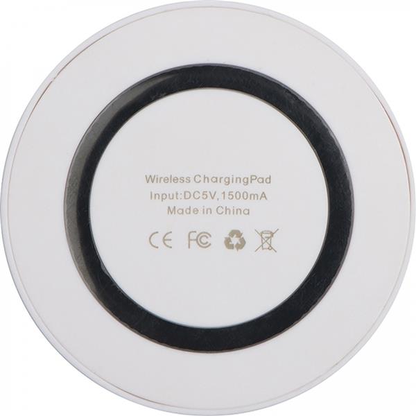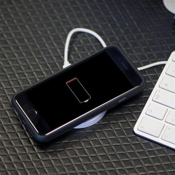 Plastikowa ładowarka indukcyjna umożliwiająca ładowanie smartfona bez użycia kabla. Ładowarka umożliwia ładowanie urządzeń marek Samsung i Apple (od modelu iPhone 8).