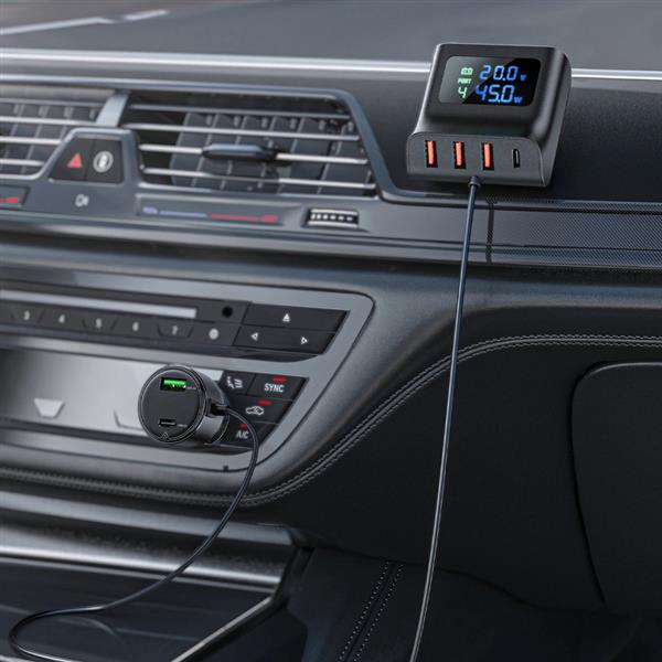 Szybka ładowarka samochodowa Acefast B11 posiada 4 złącza USB-A i 2 złącza USB-C. Cyfrowy ekran wyświetla aktualną moc i napięcie portów w czasie rzeczywistym. Pracuje z mocą 138 W do podziału na wszystkie porty. Współpracuje ze wszystkimi popularnymi markami samochodów i ciężarówek.