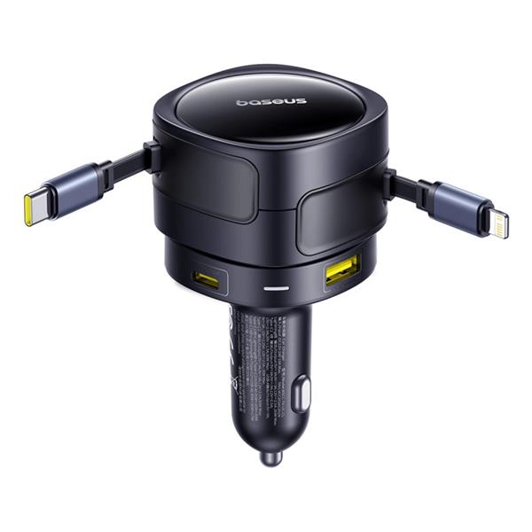 Dwa wbudowane kable (USB-C i Lightning) wysuwają się z przeciwnych boków obudowy i automatycznie się zwijają, ułatwiając organizację w aucie.