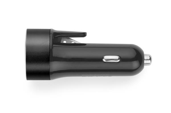 Ładowarka CRUSH to gadżet 3 w 1. Oprócz podstawowej funkcji ładowania urządzeń posiada przecinak do pasów i młotek bezpieczeństwa. To, co wyróżnia ten produkt to funkcja szybkiego ładowania QC3.0 w obu portach USB.